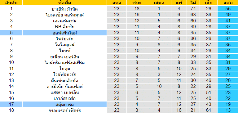 ทีม / [อันดับ] / (ราคา) : ฮอฟเฟ่นไฮม์[5] (-1) สตุ๊ตการ์ต[17]